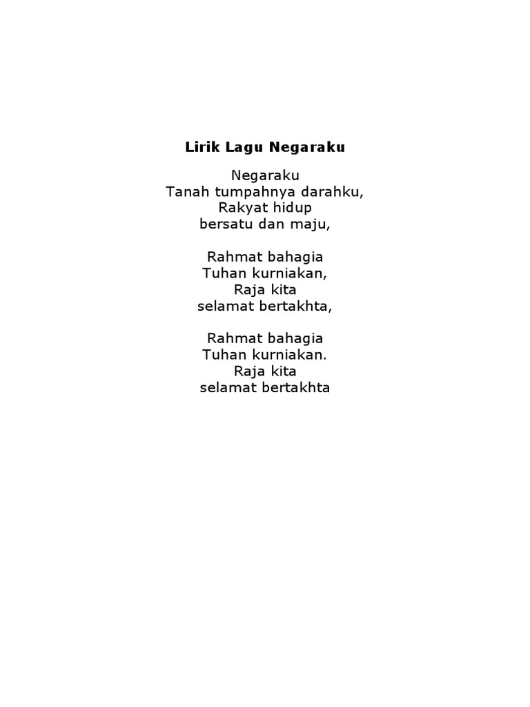 Sejarah lagu negaraku lirik lagu latarbelakang pencipta lirik lagu kebangsaan serta info yang berkaitan untuk muat turun. Indonesia negaraku Tuhan yang membrikannya. Nama Lagu Kebangsaan Etika Lirik dan maksud Sejarah Kepentingan Lagu Kebangsaan Soalan LIRIK NEGARAKU Negaraku Tanah tumpahnya darah ku Rakyat hidup bersatu dan maju Rahmat bahagia Tuhan kurniakan Raja kita selamat bertakhta Rahmat bahagia Tuhan kurniakan Raja kita selamat bertakhta 8.